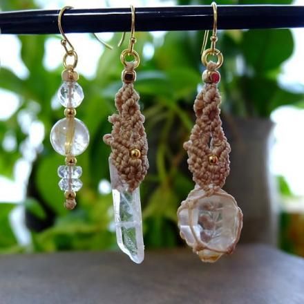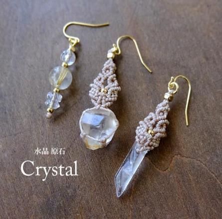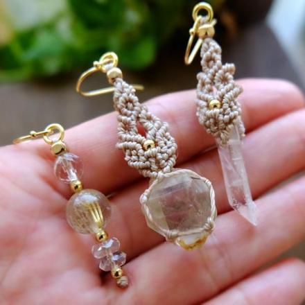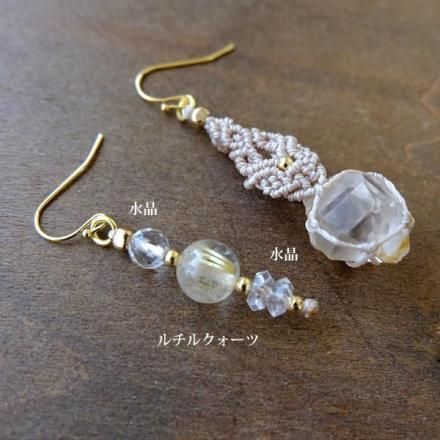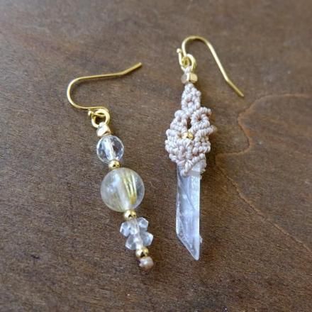 透明感もあり、自然に出来た内部のクラックも魅力的なブラジル産両剣水晶と、すっと伸びた形状も力強さを感じる水晶ポイントに、しっかりと金針が入ったルチルクォーツをセレクトして制作した左右別々のアシンメトリーデザインのマクラメ編みピアスです。