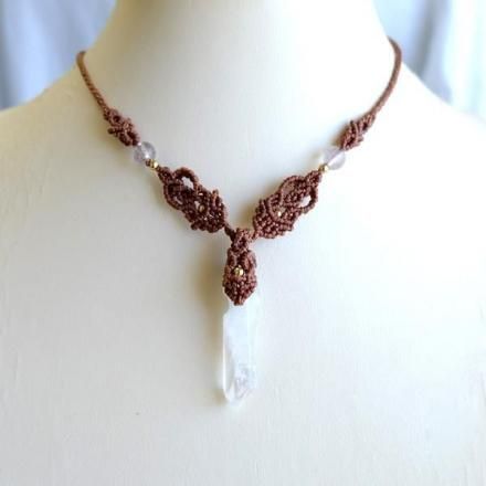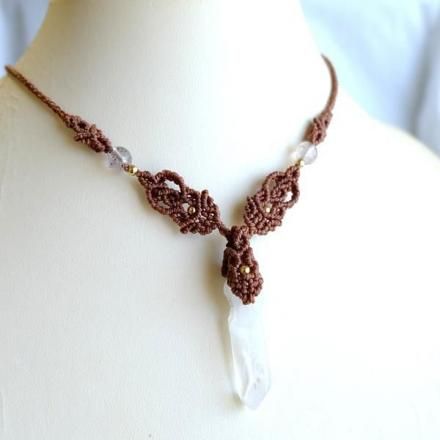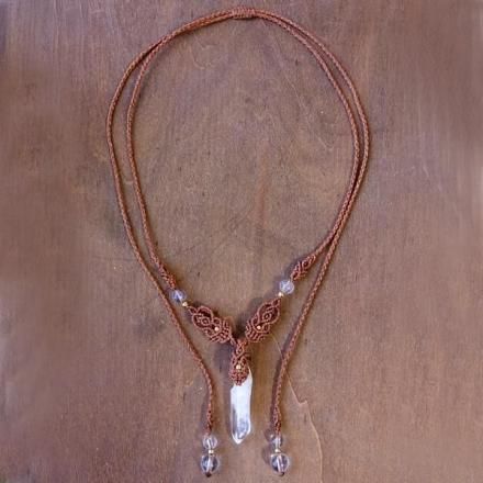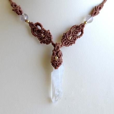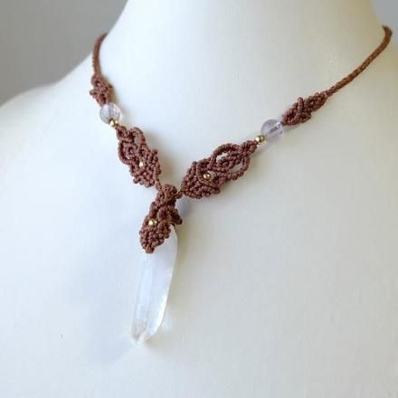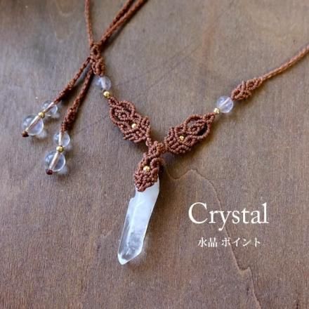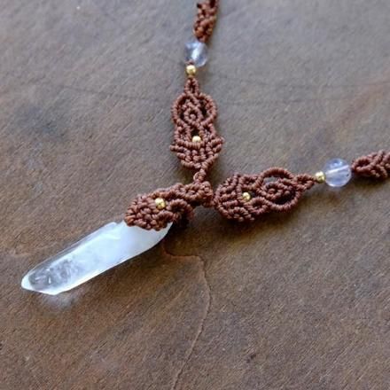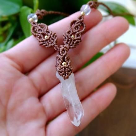 魅力的な水晶ポイントが際立つように落ち着きのある色味のあるコードでシンプルながらも繊細に編み込み首元を華やかに彩る印象的なマクラメ編みアクセサリーに仕上げました。