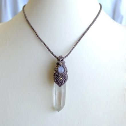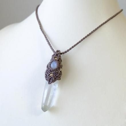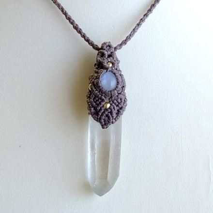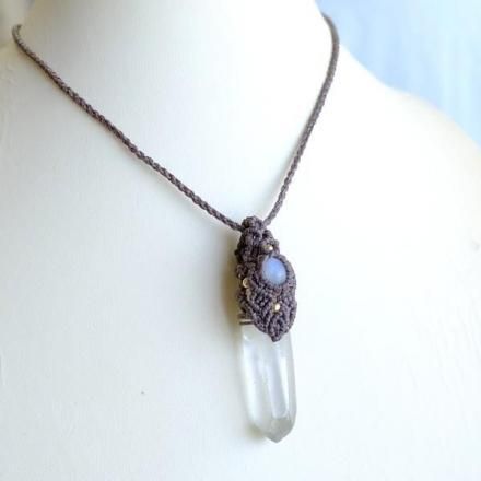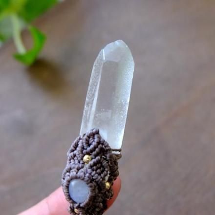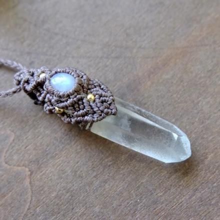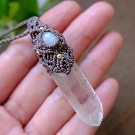 みずみずしく透明度のある美しいヒマラヤ水晶ポイントと、スリランカ産ムーンストーンをあわせた1点ものマクラメ編みペンダントネックレスです。