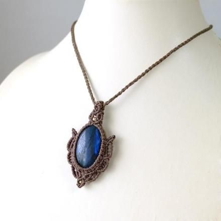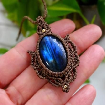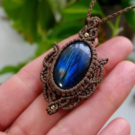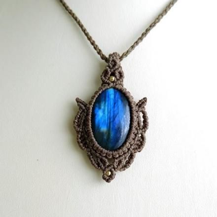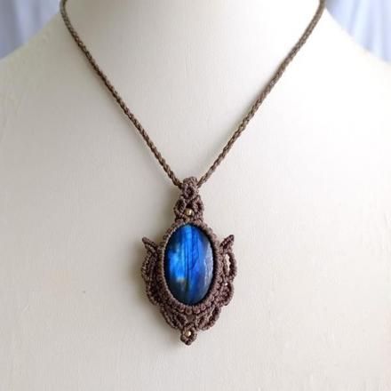 見る角度や光の角度で、石の表面に力強く艶やかに輝くブルーシラー(ラブラドレッセンス)が魅力的で美しいマダガスカル産ラブラドライトのマクラメ編みペンダントです。良質なラブラドライトを落ち着きのある色合いのコードで丁寧に編み込み、胸元を印象的に彩る1点ものマクラメ編みアクセサリーに仕上げました。