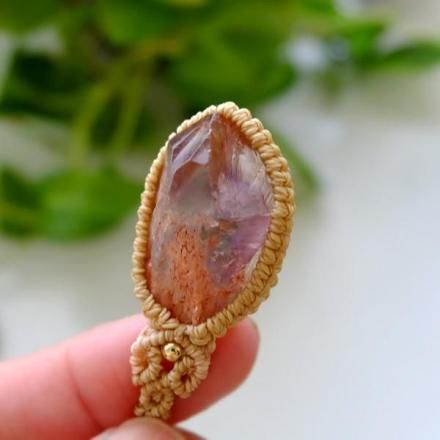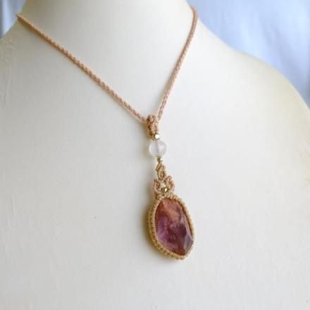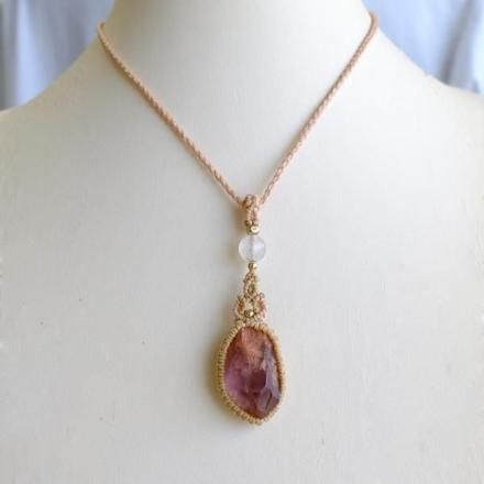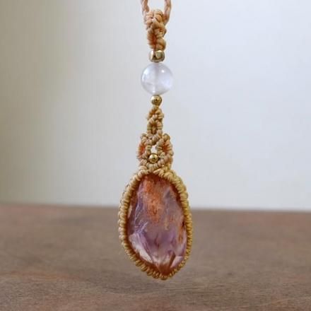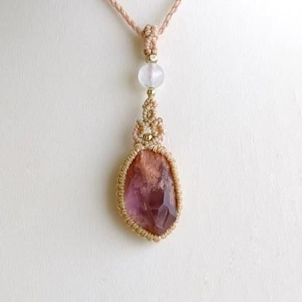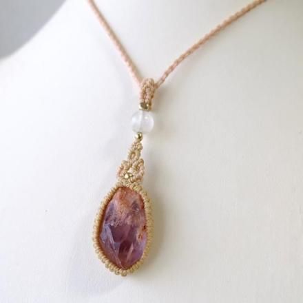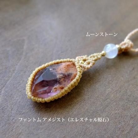 珍しいマダガスカル産のファントムアメジスト エレスチャル原石と月のようにしっとりと輝くタンザニア産ムーンストーン丸玉を組み合わせたマクラメ編みペンダントネックレスです。天使のギフトと称される神秘的なアメジスト原石をシンプルながらも存在感のあるペンダントに仕上げました。