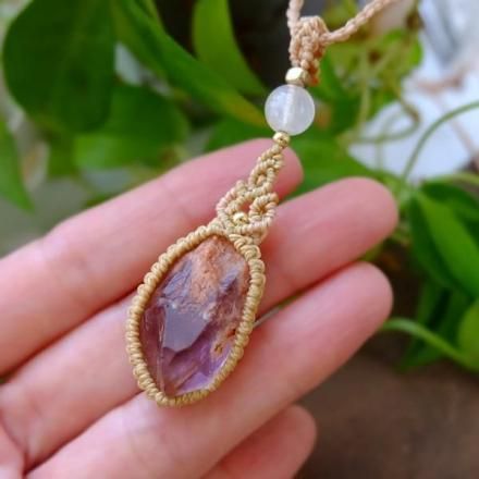 アメジスト ファントムエレスチャル原石 (マダガスカル産)・ムーンストーン マクラメ編みペンダントネックレス 誕生日プレゼントギフト 3168