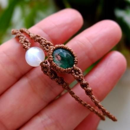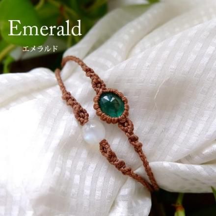 小ぶりサイズながらもカボションカットされた面が光を反射させます。優しい輝きが美しいエメラルドが引き立つように、落ち着きのある色味のコードでシンプルながらも存在感溢れるマクラメブレスレットに仕上げました。