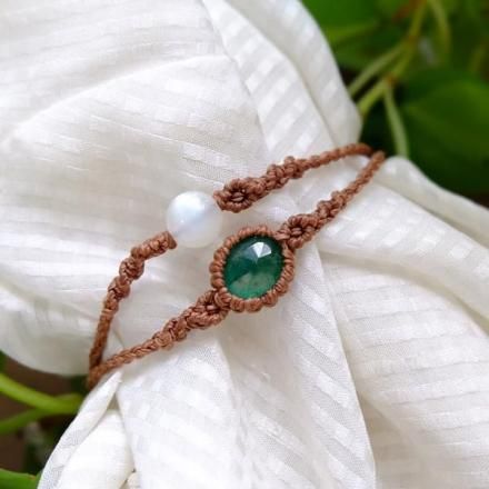 透明感があり、鮮やかなエメラルドグリーンが魅力的なコロンビア産エメラルドと月のようにしっとりと輝きブルーシラーが現れる良質なムーンストーン丸玉を合わせた2連マクラメブレスレットです。