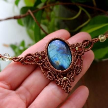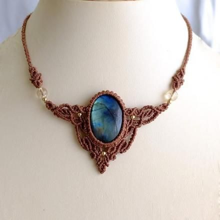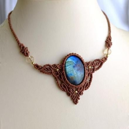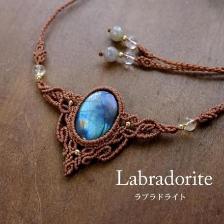 一見暗めな石ですが、多彩な色彩がまるでオーロラのようなラブラドライトと小粒ながらも良質な天然シトリンを組み合わせ首元を華やかに彩る印象的なマクラメ編みアクセサリーに仕上げました。