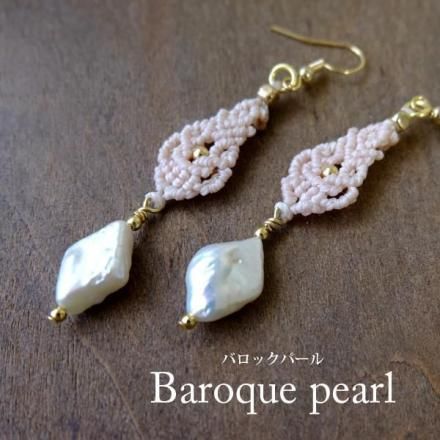 小ぶりサイズですが、見る角度でキラリと輝き、ころっとした形が愛らしいバロックパールをセレクトしました。明るめのコードでゆらゆらと揺れる印象的で魅力あふれるピアスに仕上げました。