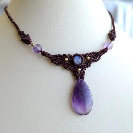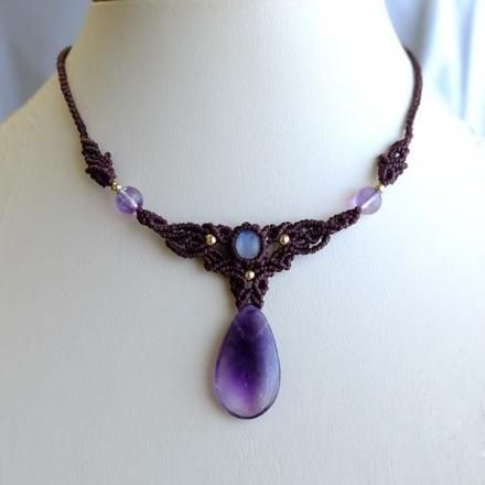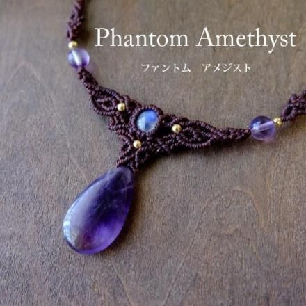 みずみずしく透明感があり内部にクラックがありますが、独特な紫のグラデーションが幻想的なインド産ファントムアメジストと上部には小粒ながらも見る角度によって現れるブルーシラーが美しいムーンストーンを合わせたマクラメ編みチョーカーネックレスです。
