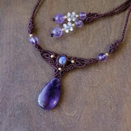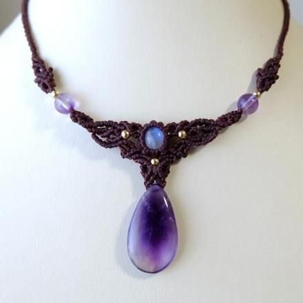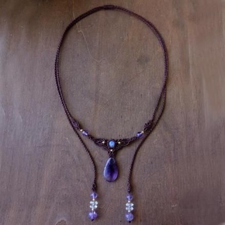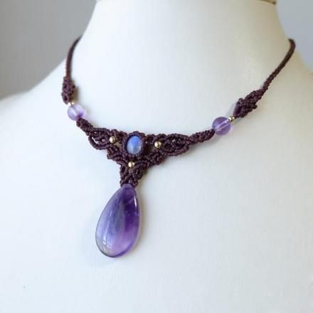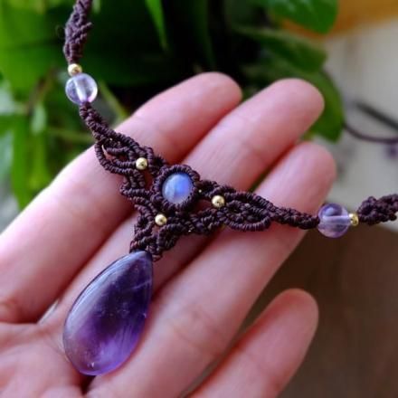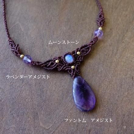 ファントムアメジスト (インド産)・ムーンストーン1点ものマクラメ編みチョーカーネックレス 誕生日プレゼント・クリスマスギフト 3498