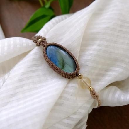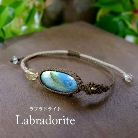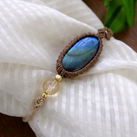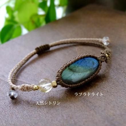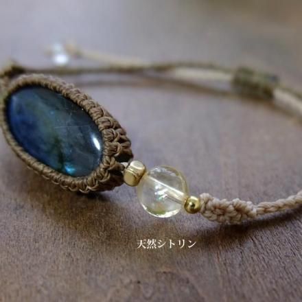 光や見る角度によって、石全体にゴールド、ブルーのシラー(ラブラドレッセンス)が煌めく魅力的なツートンカラーのマダガスカル産ラブラドライトをメインに、サイドに良質なブラジル産天然シトリンを合わせた1点ものアシンメトリーマクラメ編みブレスレットです。
