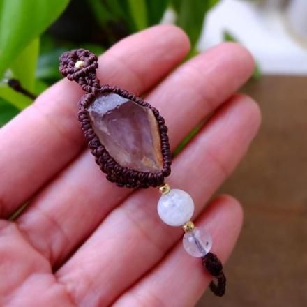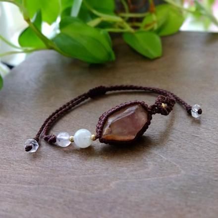 天使のギフトと称されるマダガスカル産アメジスト原石(ファントムエレスチャル)をメインに、サイドには月のようにしっとりと輝くムーンストーンとヒマラヤローズクォーツを合わせ、個性的で存在感溢れるアシンメトリマクラメ編みブレスレットに仕上げました。