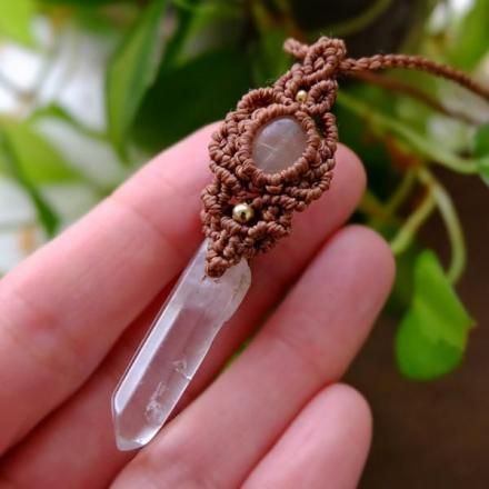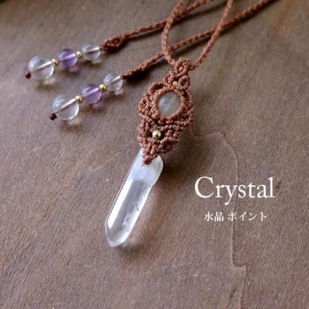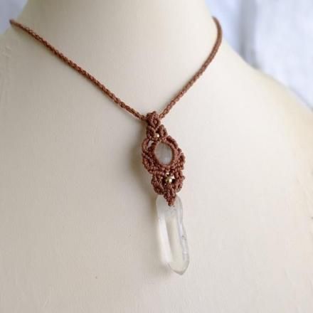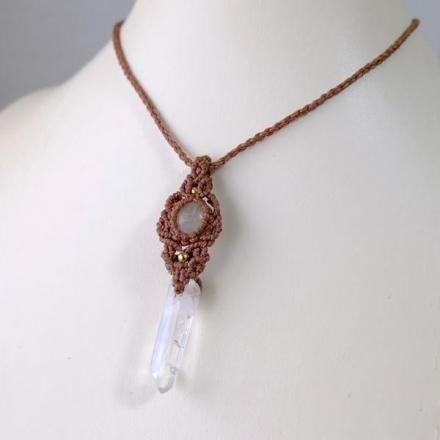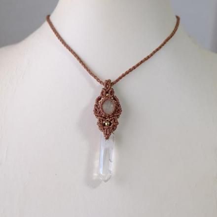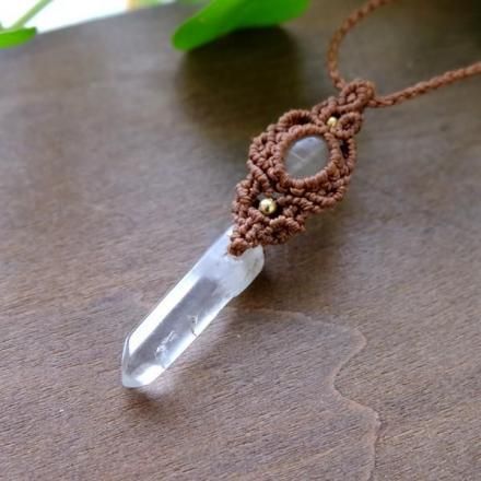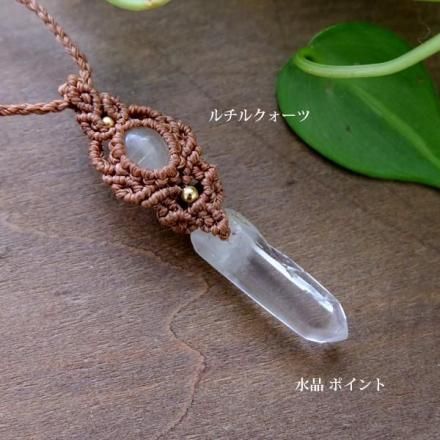 透明感もあり、自然に出来た内部のクラックも神秘的なブラジル産水晶ポイント原石と細い金針入りのルチルクォーツを組み合わせたマクラメ編みミニペンダントネックレスです。