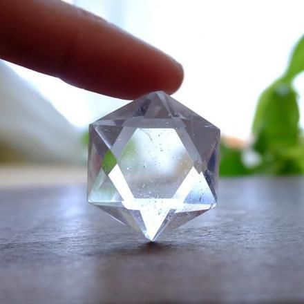 ブラジル産の透明感のある水晶の中に、正三角形と逆三角形があわさった形の六芒星がカットされた美しい天然水晶です。
