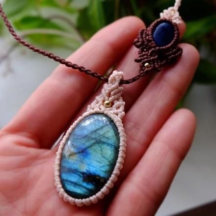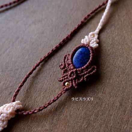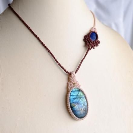 力強く神秘的に輝くラブラドライトとラピスラズリが引き立つように、2色のコードで丁寧に編み込み印象的なマクラメアクセサリーに仕上げました。